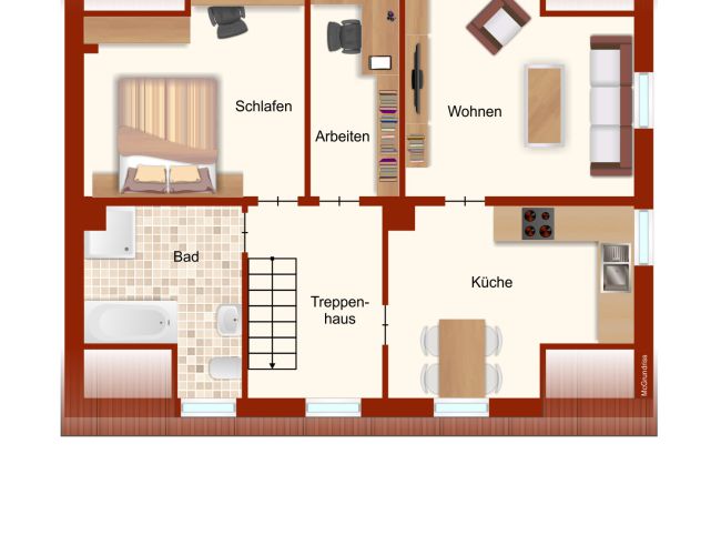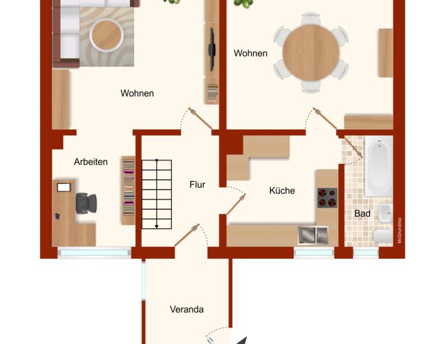 Das Erdgeschoss besticht durch zwei große Zimmer, eine geräumige Küche, ein Arbeitszimmer, ein Badezimmer mit Wanne sowie ein Gästezimmer. Hier finden Sie viel Platz für Ihre Familie oder eine flexible Nutzung der Räume.