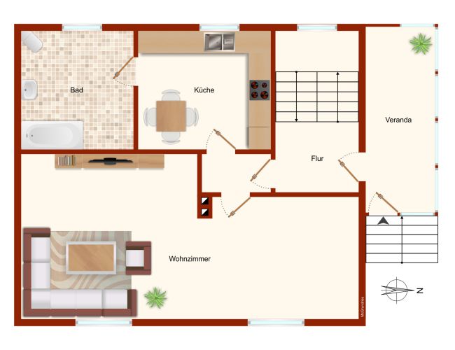 Sie betreten das Haus durch eine großzügig verglaste Veranda. Der angrenzende Flur bietet einen Zugang zur Küche, dem Wannenbad und dem großzügigem Wohnzimmer. Über das Treppenhaus haben Sie einen Zugang zum Keller und zum Obergeschoß. Hier befindet sich ein Durchgangszimmer, ein Gäste-WC und ein weiterer großzügiger Raum mit separatem Ankleidezimmer.