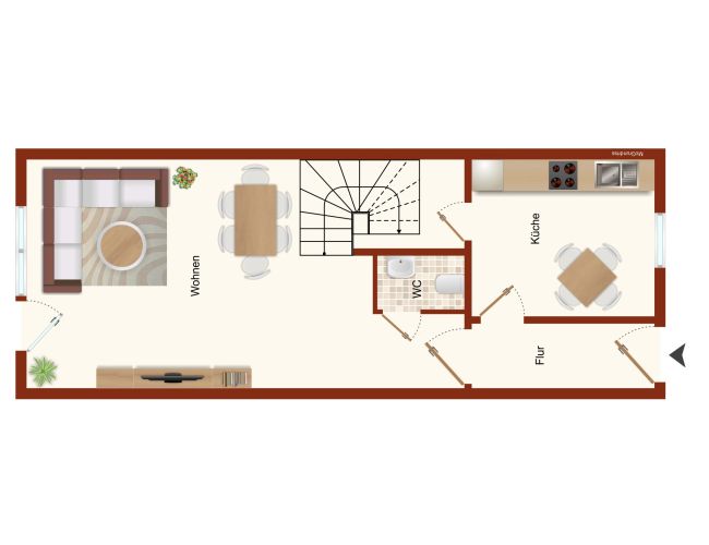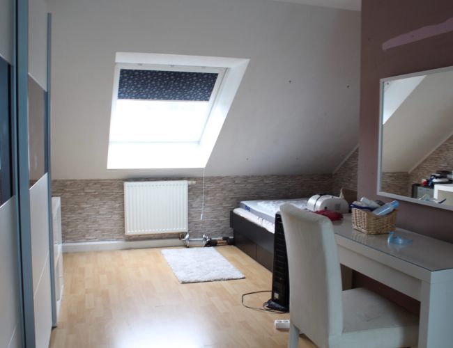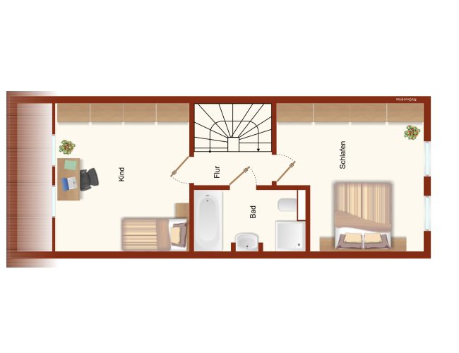 Im Erdgeschoss des Hauses erwartet Sie ein großzügiger und lichtdurchfluteter Wohnbereich mit Ausgang in den Garten mit Südausrichtung. Auf dieser Etage ist weiterhin die großzügige Küche mit Einbaumöbeln, ein Gäste-WC, der Flur und die Garderobe untergebracht. Im Obergeschoß befindet sich das Bad mit Dusche und Wanne neben dem großen Schlafzimmer. Daneben ist ein weiteres Zimmer mit Gartenblick vorhanden. Das Dachgeschoss braucht wenig Phantasie für diverse Nutzungsmöglichkeiten.