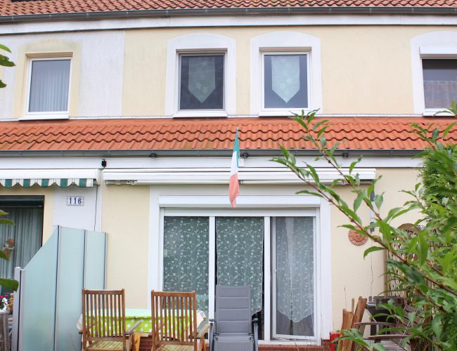 Vor dem Wohnzimmer ist eine großzügige Terrasse in Südausrichtung angelegt worden. Die Beschattung kann über eine elektrisch betrieben Markise erfolgen.
